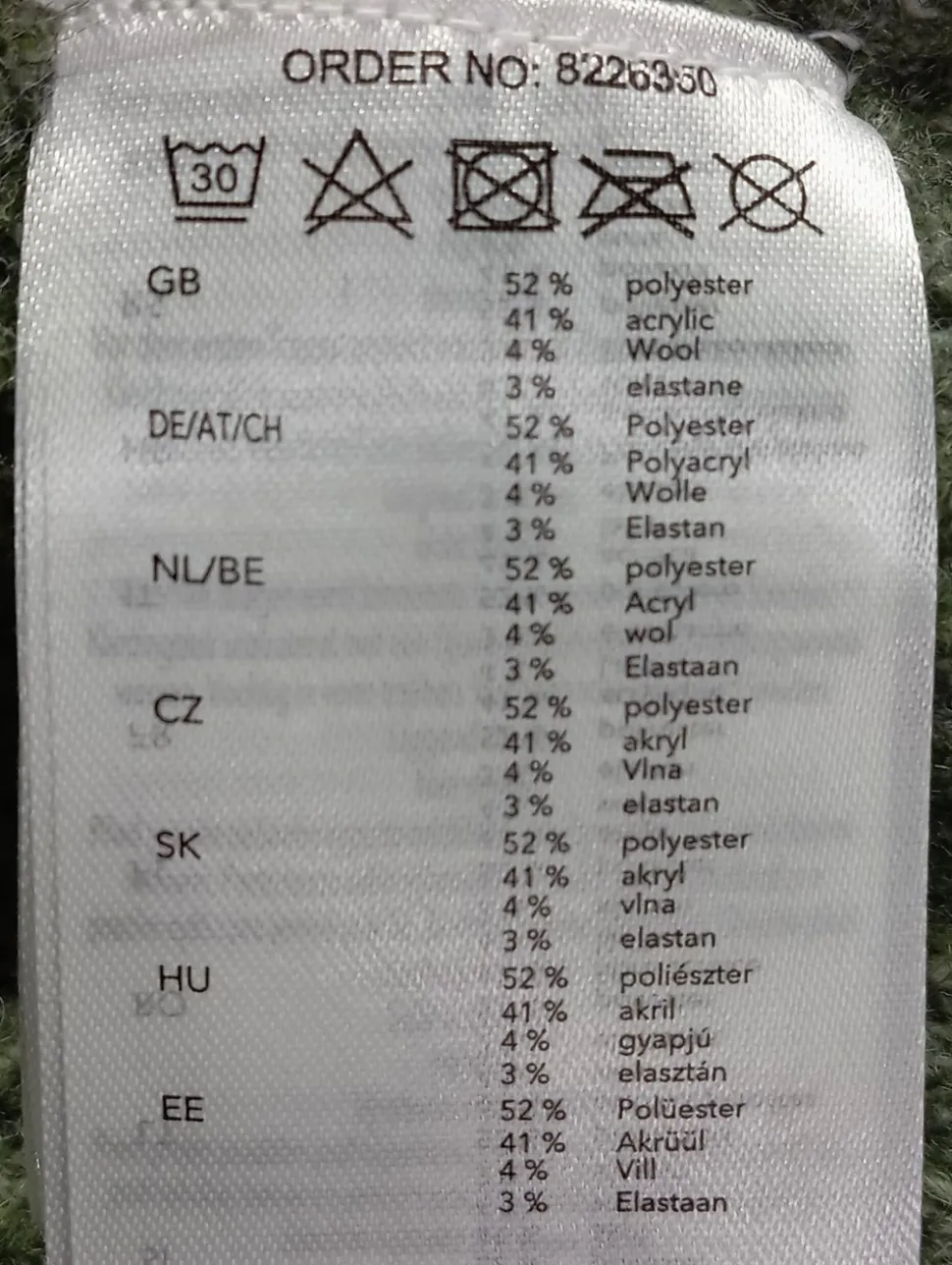- Außenmaterial: 52% Polyester, 41% Polyacryl, 4% Wolle, 3% Elasthan