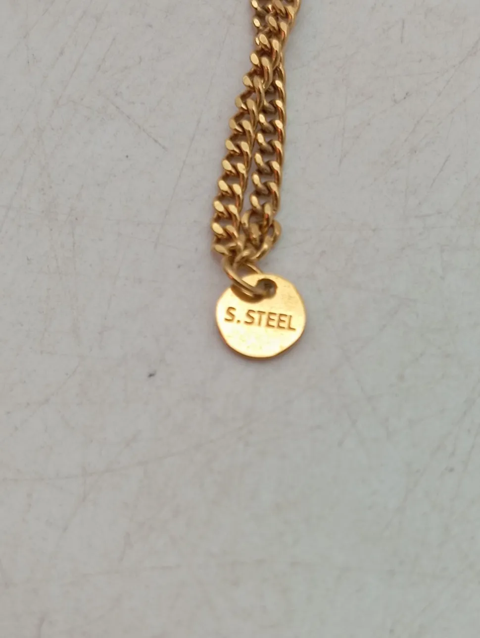 - Details: goldfarbiges Material, feingliedrige Kette, Labelgravur, Metallelemente