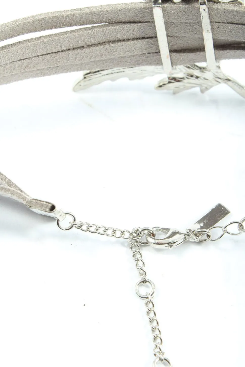 - Details: silberfarbiges Material, große Anhänger, Kunstlederband, längenverstellbare Kette, Dekoelemente, Glitzersteinverzierung, Metallelemente