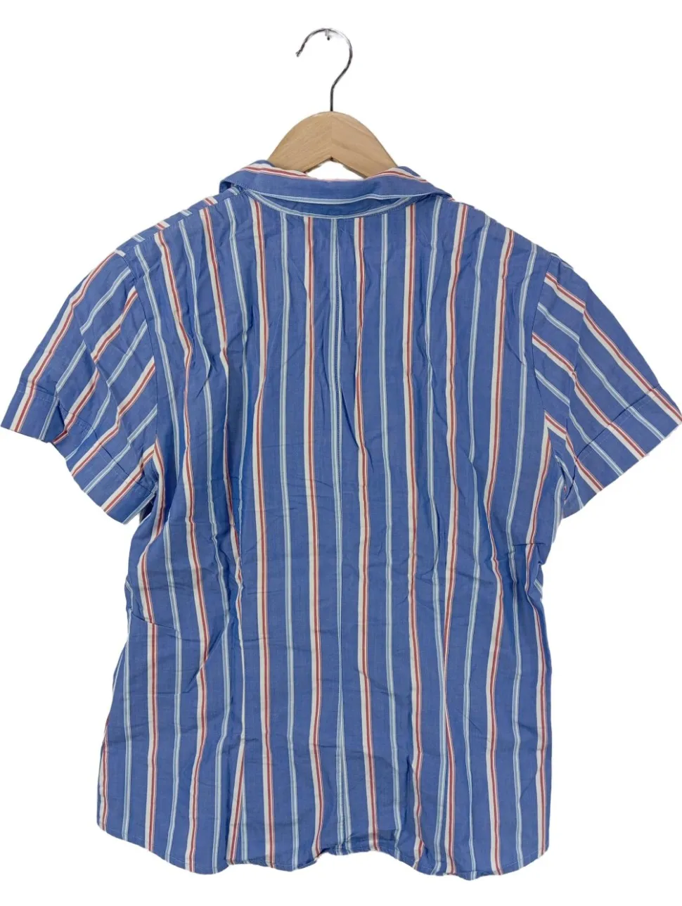 - V-Ausschnitt, Umlegekragen, Bund am Ärmelsaum, Knopfverschluss, Streifenmuster, Casual-Look, schlichter Stil, Vintage-Look
