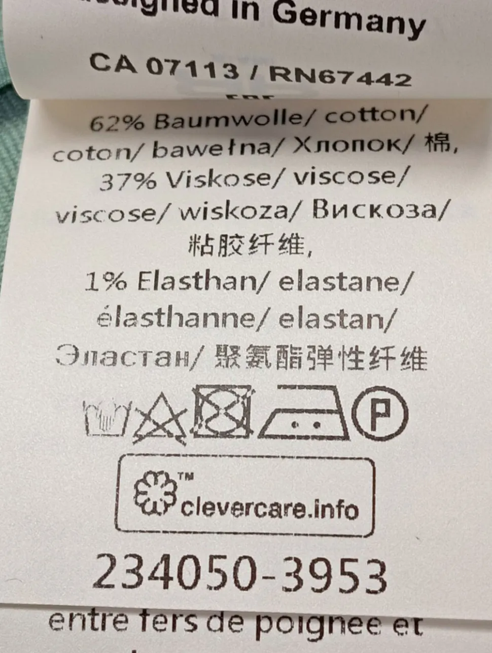 - Außenmaterial: 62% Baumwolle, 37% Viskose, 1% Elasthan