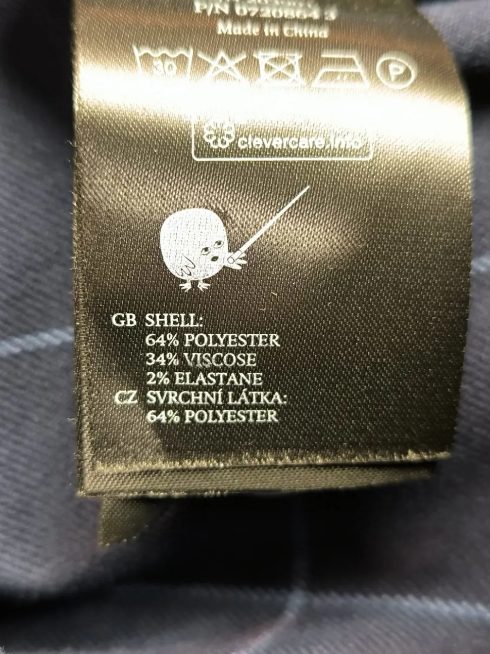 - Außenmaterial: 64% Polyester, 34% Viskose, 2% Elasthan