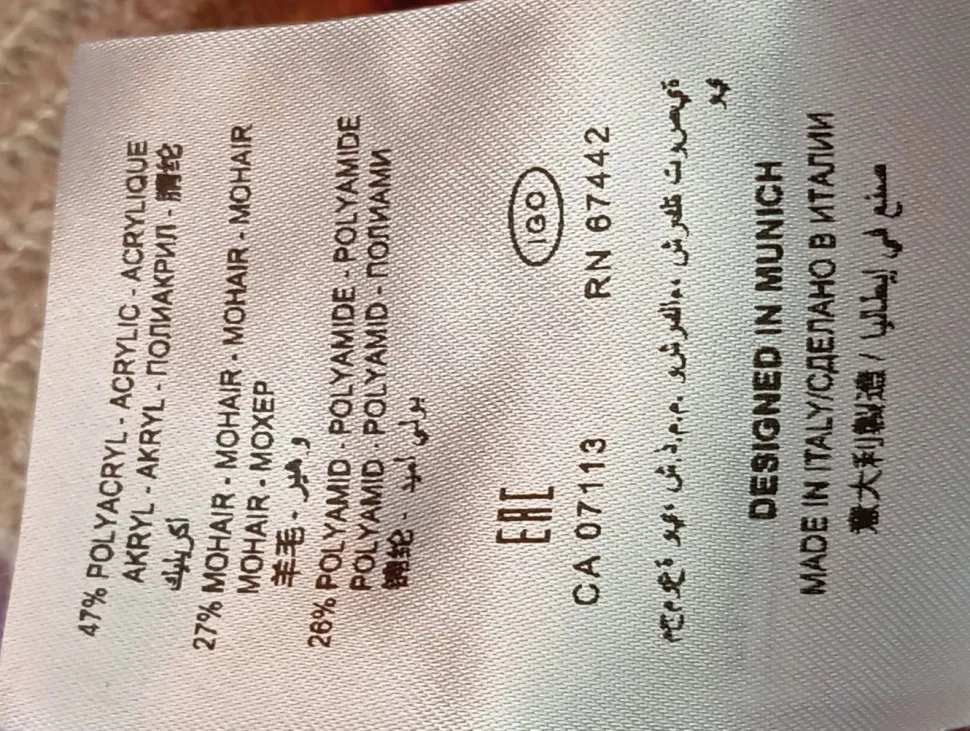 - Außenmaterial: 47% Polyacryl, 27% Mohair/Wolle/Tierhaar, 26% Polyamid