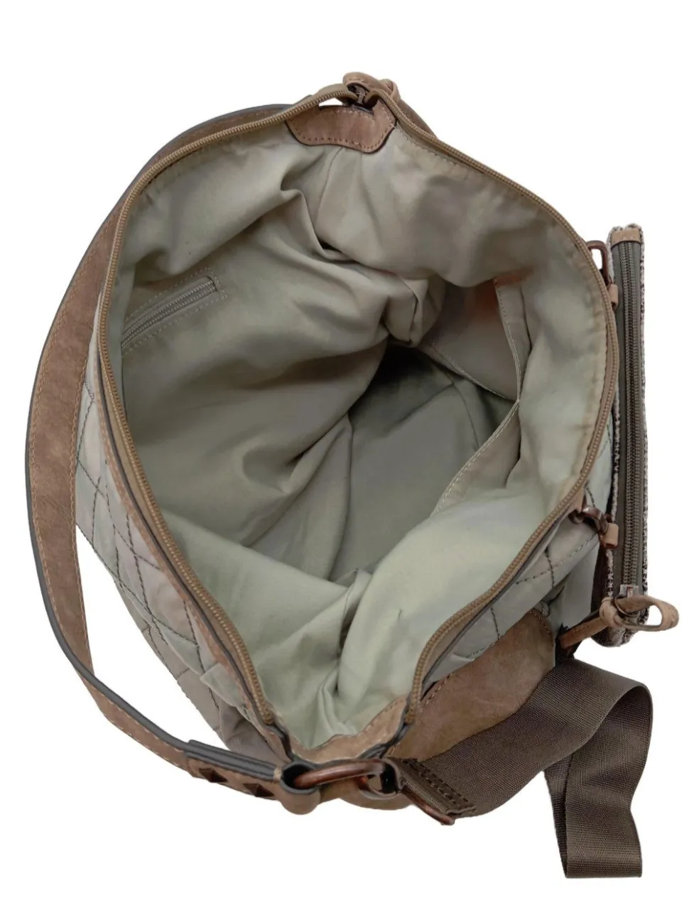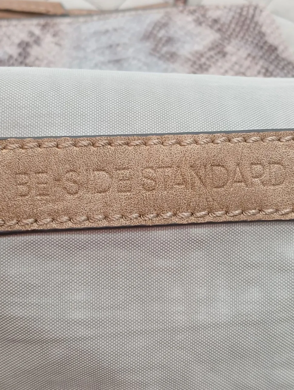 - Details: Henkel, Schulterriemen, Karabinerelemente, Lederelemente, Metallelemente, Steppungen, Logo-Applikation innen aus Leder, Reißverschlussinnenfach, verschließbares Innenfach