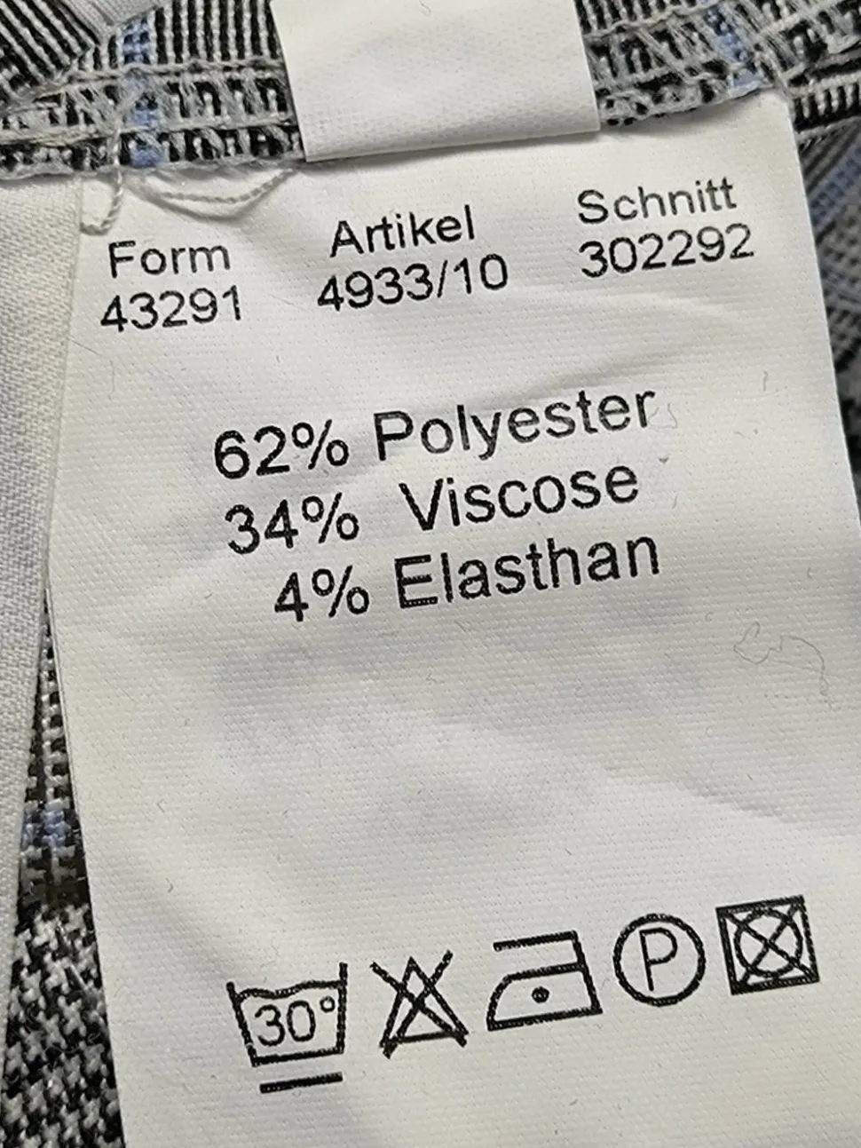 - Außenmaterial: 62% Polyester, 34% Viskose, 4% Elasthan