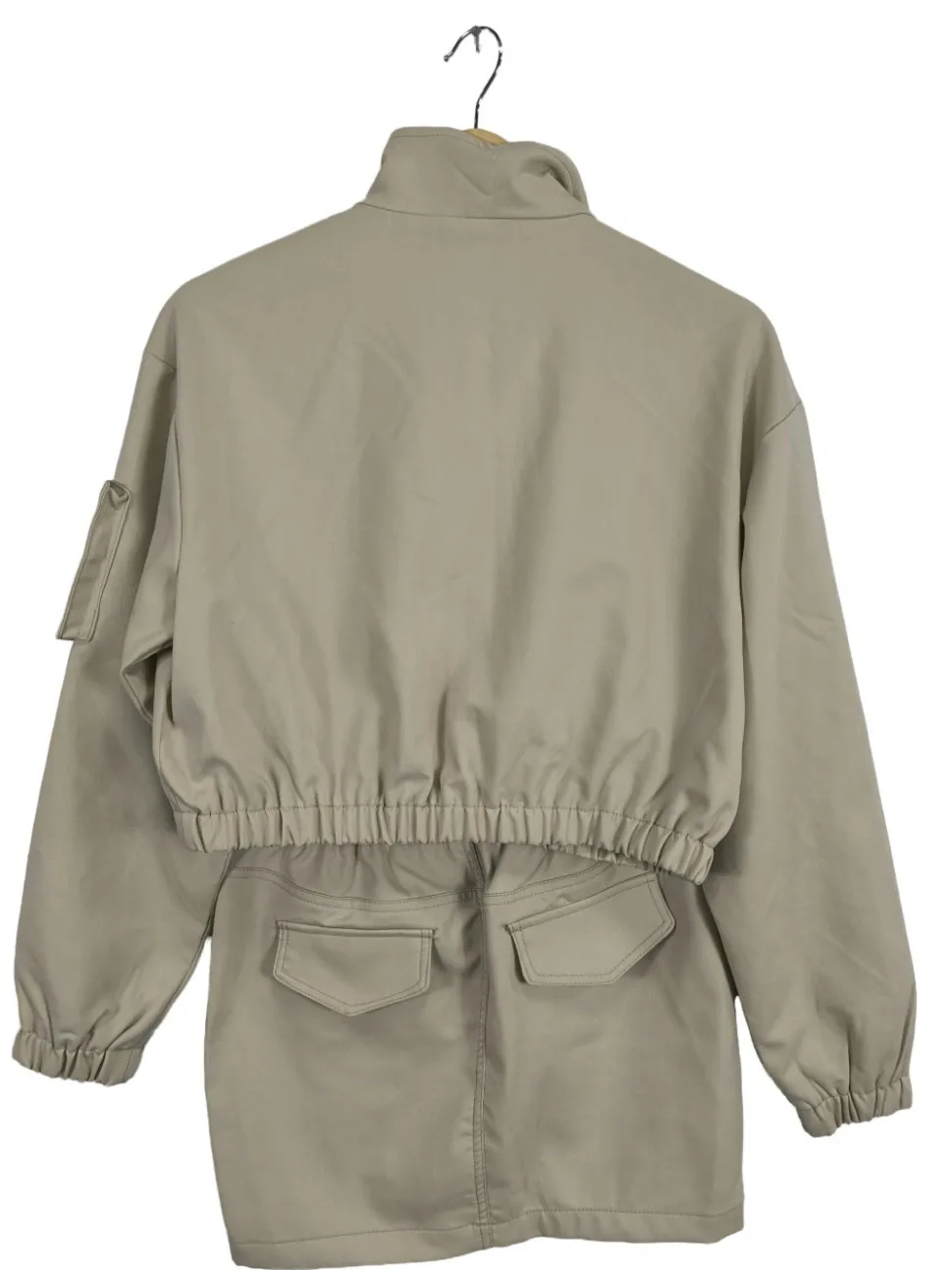 - hochgeschnittener Kragen, Elastikbündchen am Ärmelsaum, Reißverschluss, Blasebalgtaschen, Eingriffstaschen, Gesäßtaschen, Pattentaschen, Taschen mit Druckknopfverschluss, Casual-Look, Street-Fashion-Look