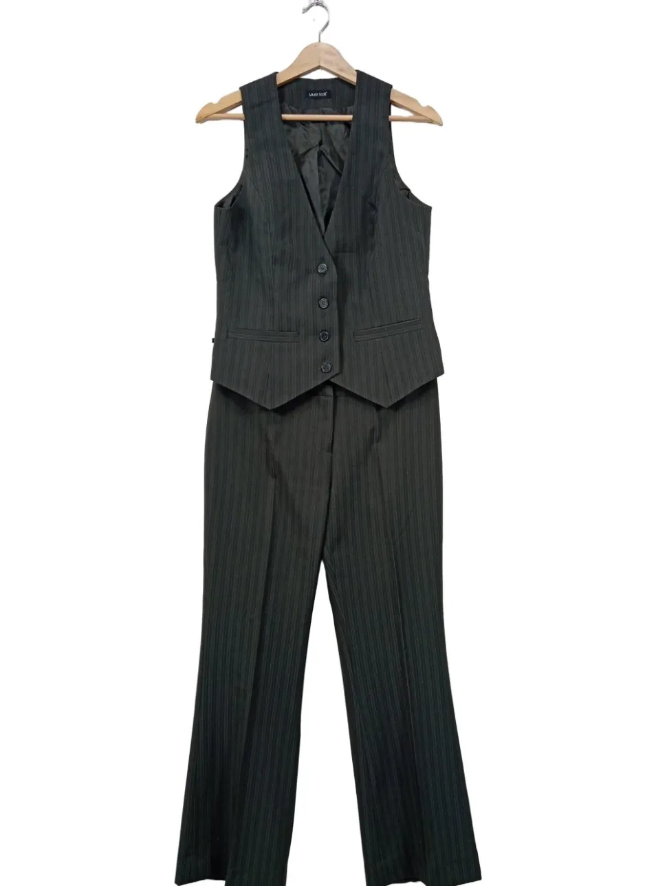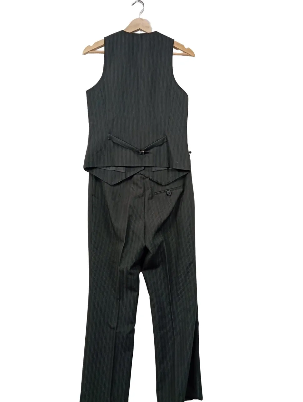- V-Ausschnitt, Knopfverschluss, Gesäßtaschen, Leistentaschen, Paspeltaschen, Streifenmuster, Business-Look, klassischer Stil