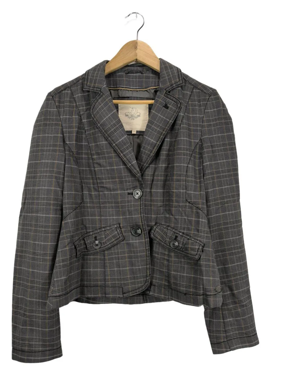 - V-Ausschnitt, Umlegekragen, Knopfverschluss am Ärmelsaum, Knopfverschluss, Pattentaschen, Taschen mit Knopfverschluss, Karomuster, Casual-Look, schlichter Stil, Vintage-Look