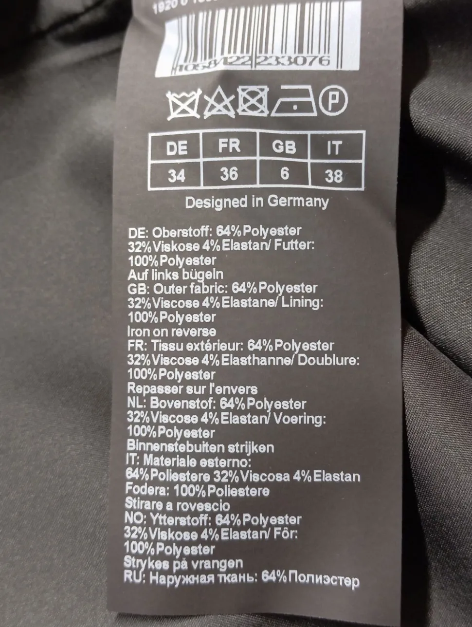 - Außenmaterial: 64% Polyester, 32% Viskose, 4% Elasthan