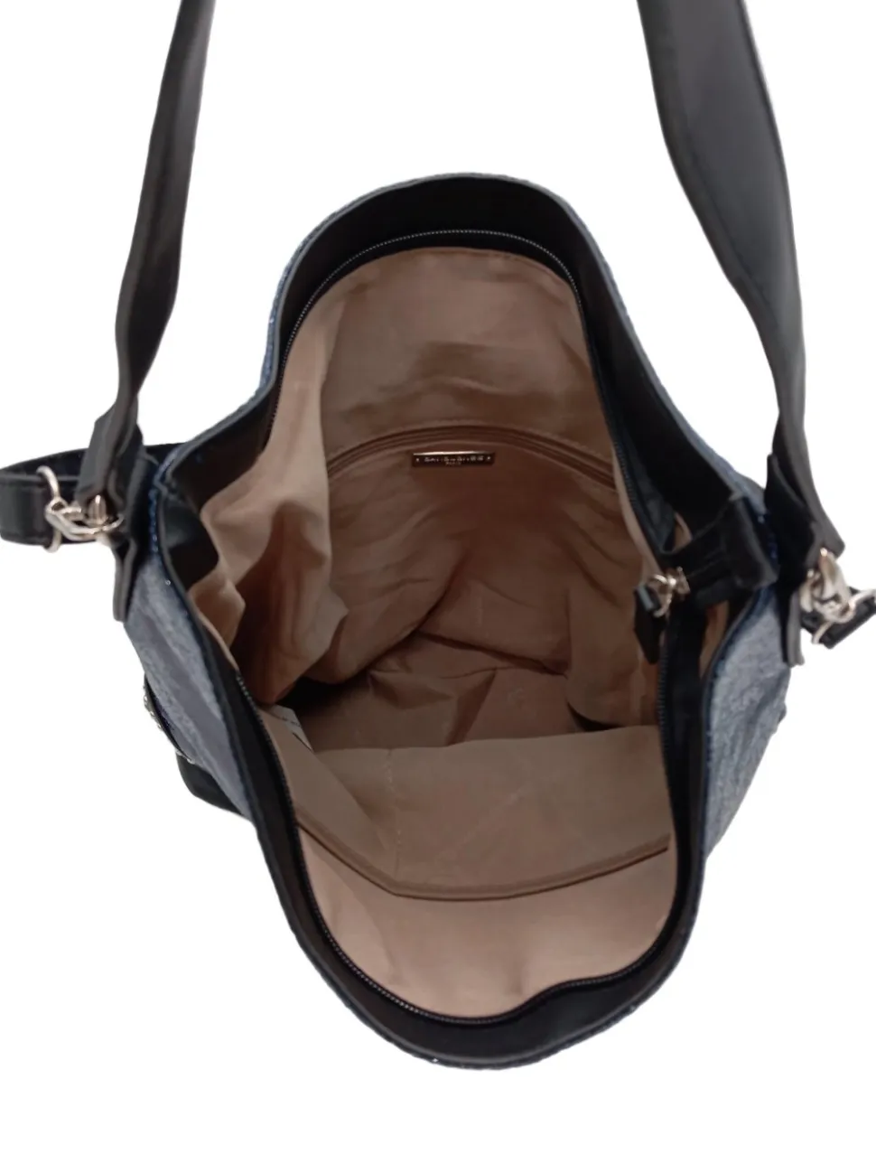 - Details: silberfarbene Hardware, Henkel, Karabinerelemente, Metallelemente, Nietenelemente, Zierbesatz, Logo-Applikation innen, Reißverschlussinnenfach