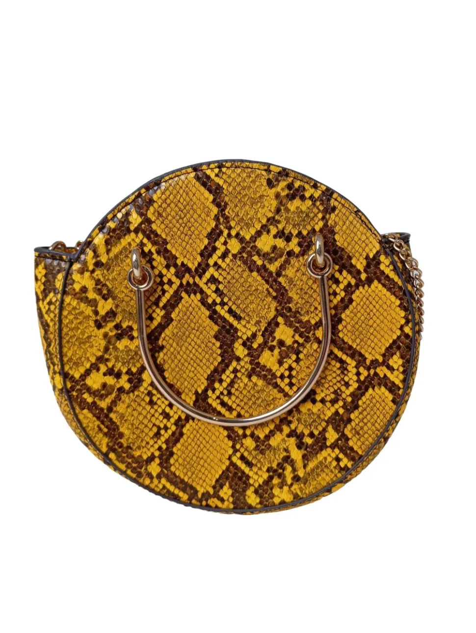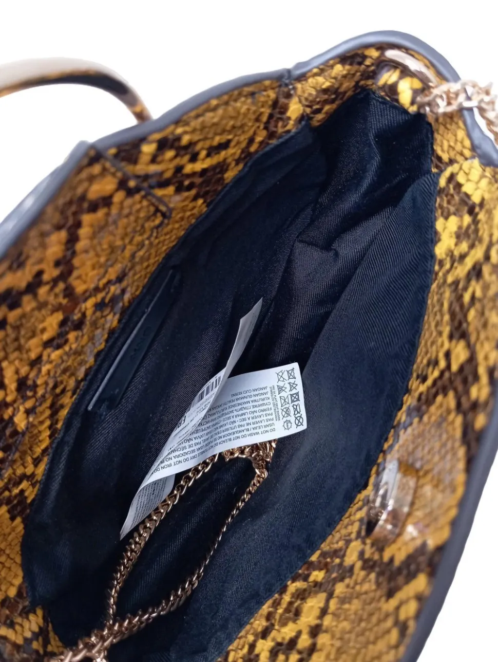 - Details: goldfarbene Hardware, Henkel, Tragekette, Metallelemente, Paspelkanten, Logo-Applikation innen aus Leder, halboffenes Innenfach