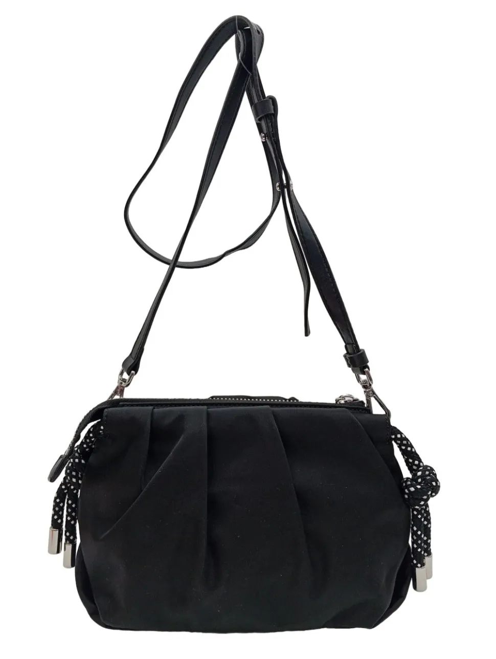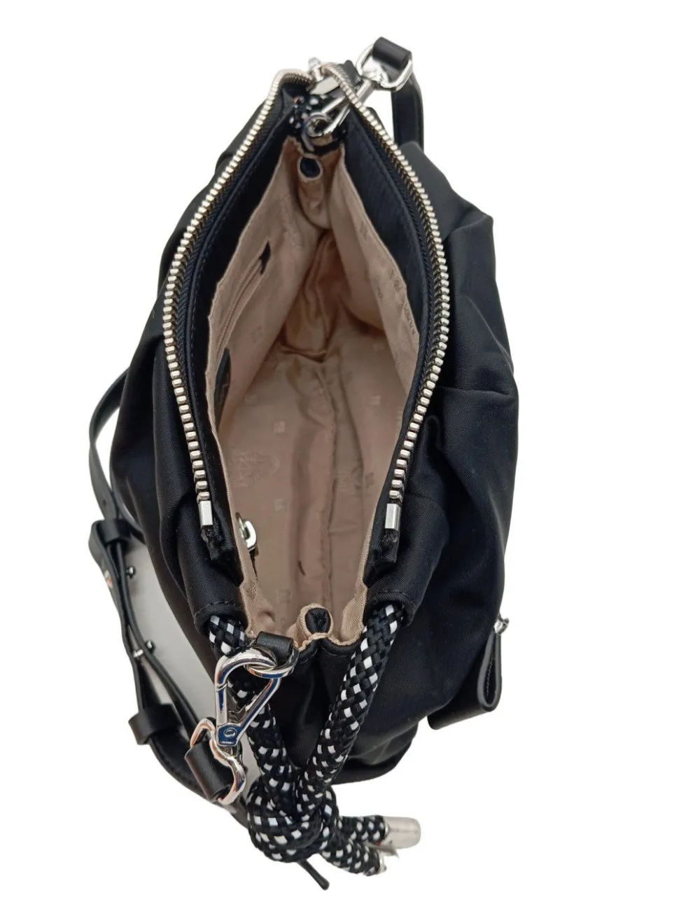 - Details: Schulterriemen, Karabinerelemente, Metallelemente, Reißverschlusstasche außen, gemustertes Futter, Logo-Applikation innen aus Leder, Reißverschlussinnenfach, verschließbares Innenfach