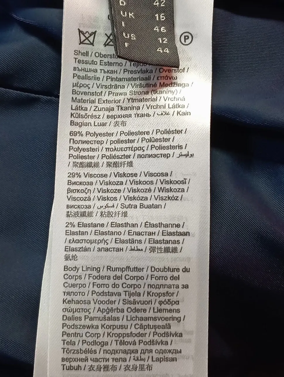 - Außenmaterial: 69% Polyester, 29% Viskose, 2% Elasthan