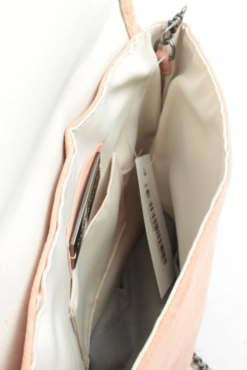 - Details: schwarz-metallische Hardware, Tragekette, Metallelemente, Logo-Applikation innen aus Metall, offenes Innenfach