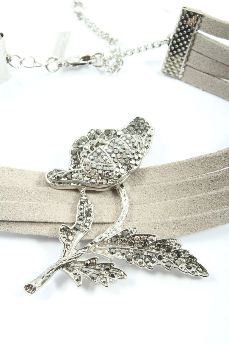 - Details: silberfarbiges Material, große Anhänger, Kunstlederband, längenverstellbare Kette, Dekoelemente, Glitzersteinverzierung, Metallelemente
