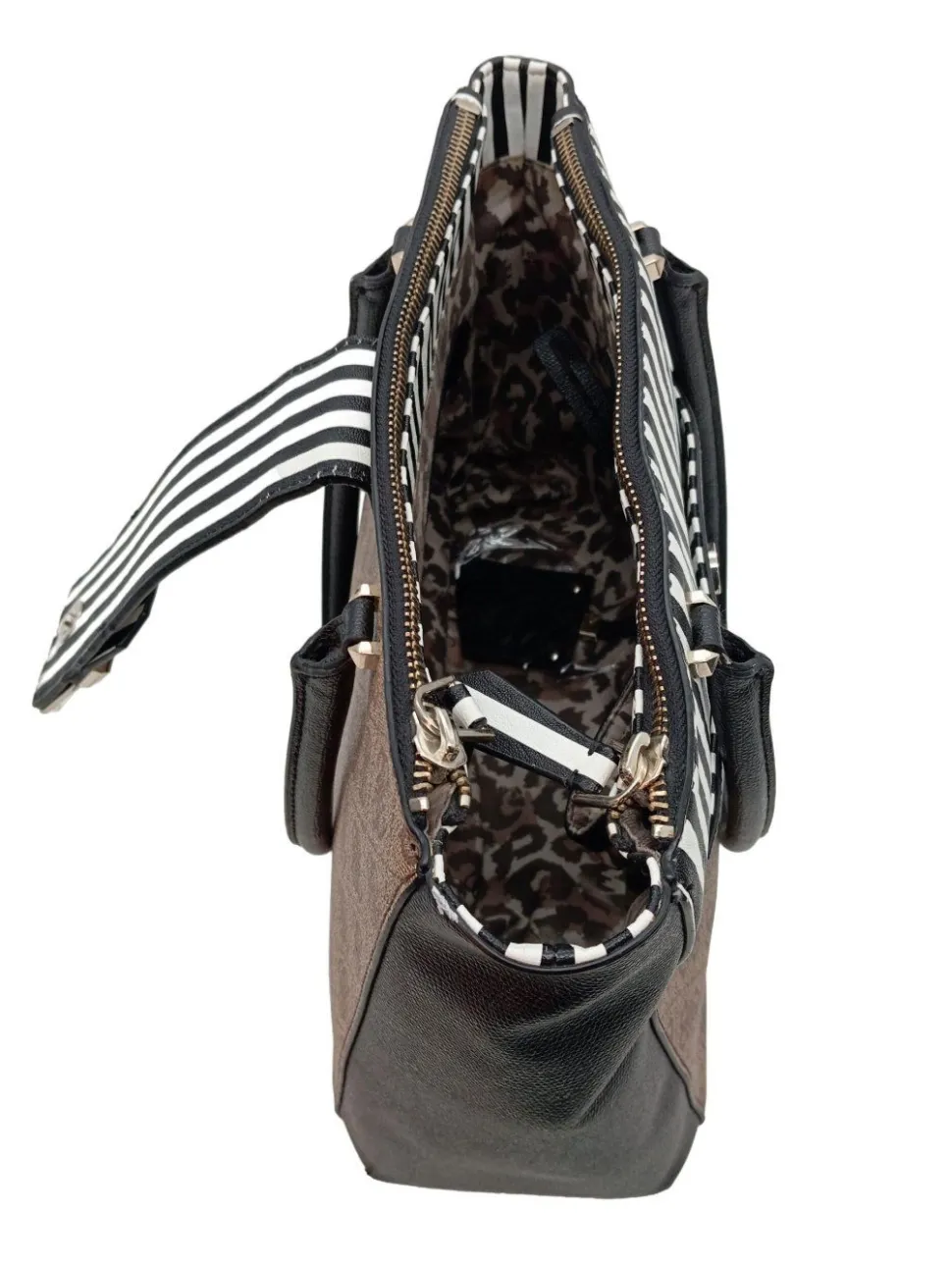 - Details: goldfarbene Hardware, Standfüßchen, Henkel, Metallelemente, gemustertes Futter, Logo-Applikation innen aus Metall, halboffenes Innenfach, Reißverschlussinnenfach