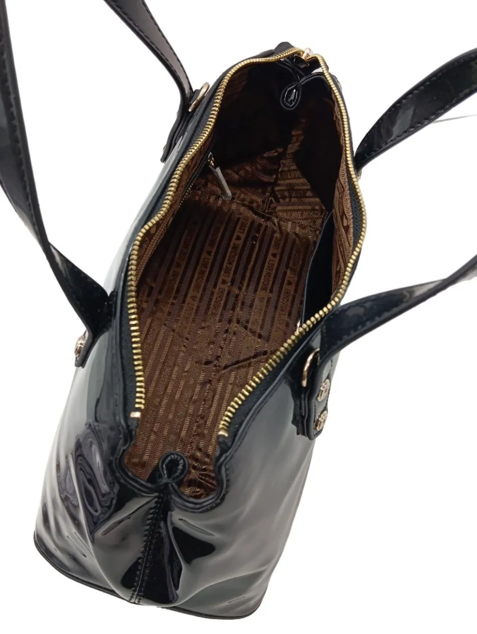 - Details: goldfarbene Hardware, Henkel, Schulterriemen, Logo-Applikation aus Metall, Ringelemente, gemustertes Futter, verschließbares Innenfach