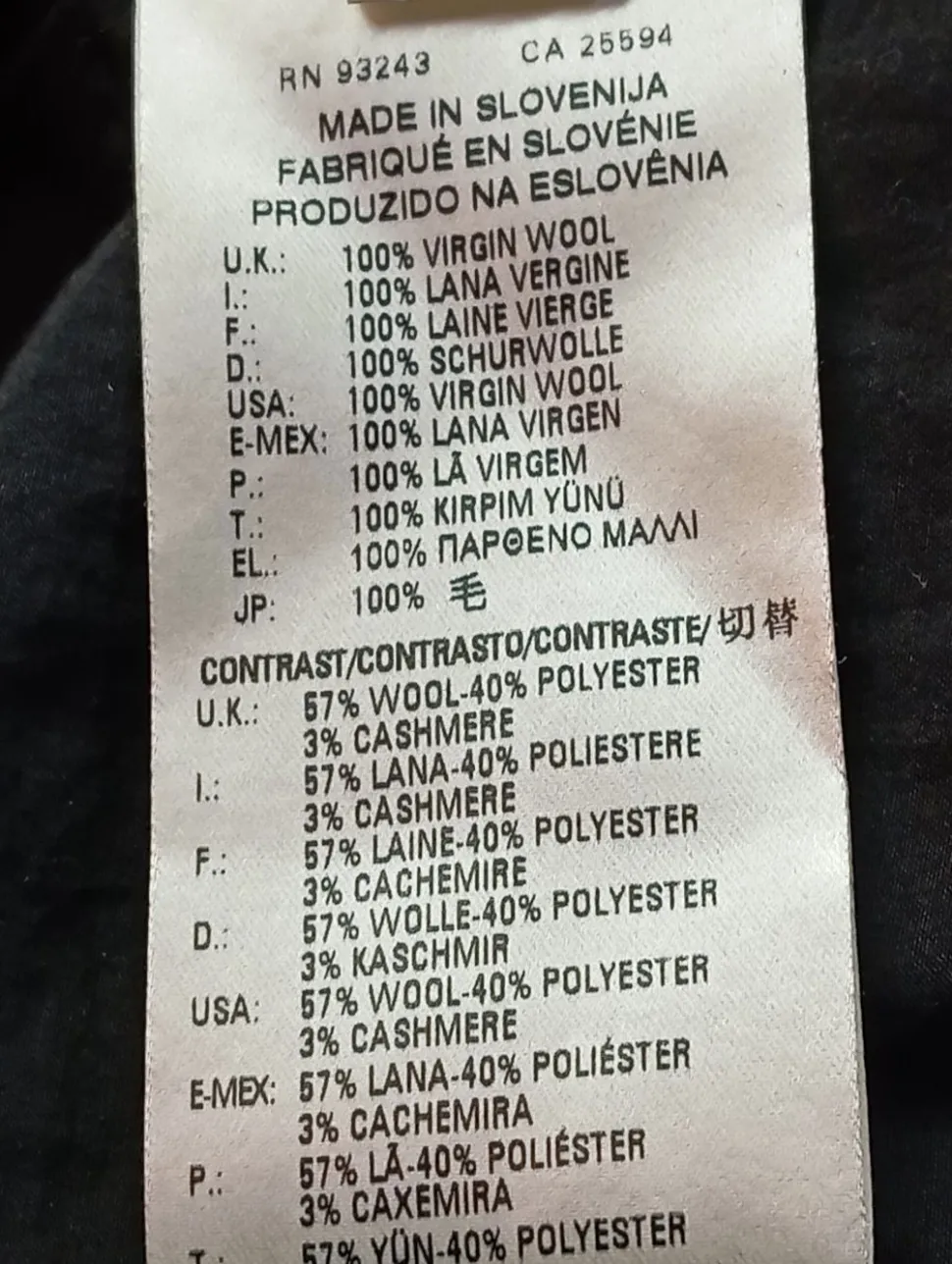 - Zweites Außenmaterial: 57% Wolle, 40% Polyester, 3% Kaschmir