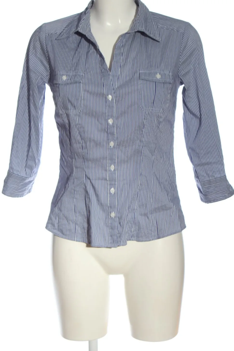 - V-Ausschnitt, Kelchkragen, Manschetten, Knopfverschluss, aufgesetzte Pattentaschen, Taschen mit Knopfverschluss, Allover-Druck, Streifenmuster, Business-Look, klassischer Stil