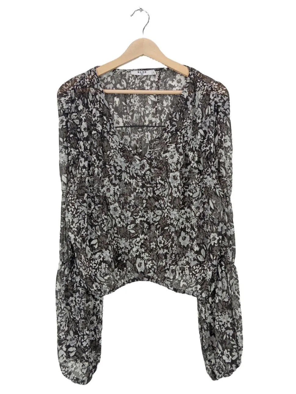 - NA-KD Langarm-Bluse, hellgrau-schwarz Allover-Druck