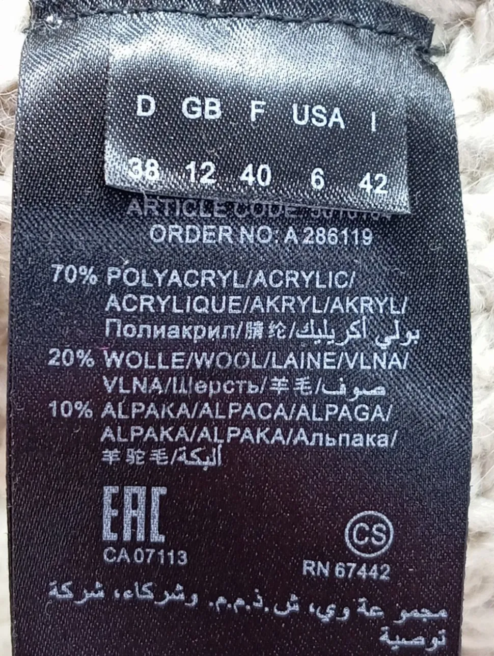 - Außenmaterial: 70% Polyacryl, 20% Wolle, 10% Alpaka/Wolle/Tierhaar