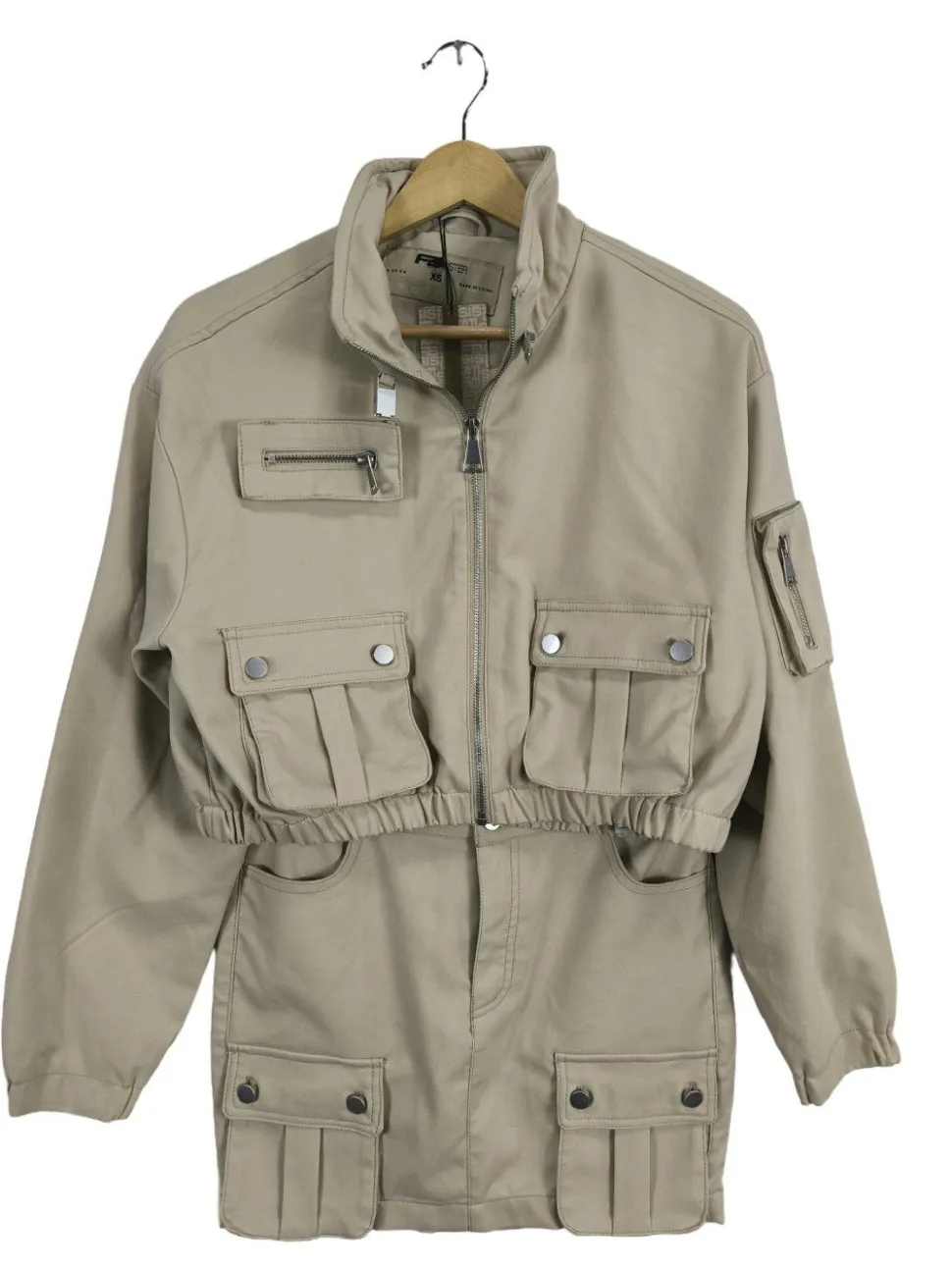 - hochgeschnittener Kragen, Elastikbündchen am Ärmelsaum, Reißverschluss, Blasebalgtaschen, Eingriffstaschen, Gesäßtaschen, Pattentaschen, Taschen mit Druckknopfverschluss, Casual-Look, Street-Fashion-Look