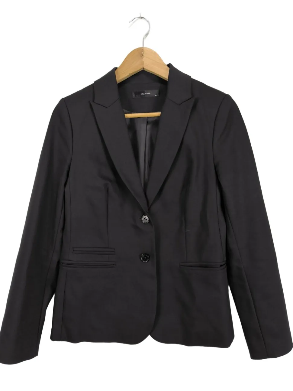 - V-Ausschnitt, Umlegekragen, Bund am Ärmelsaum, Knopfverschluss, Paspeltaschen, Business-Look, klassischer Stil