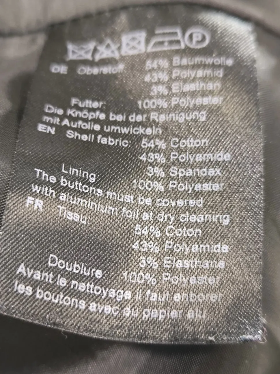 - Außenmaterial: 54% Baumwolle, 43% Polyamid, 3% Elasthan