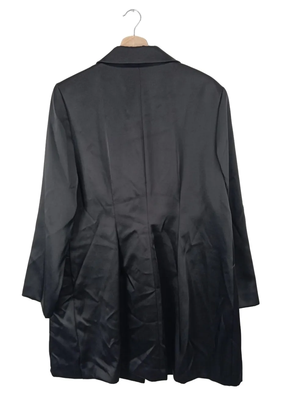 - V-Ausschnitt, Reverskragen, Bund am Ärmelsaum, doppelreihiger Knopfverschluss, Eingriffstaschen, Pattentaschen, Business-Look, Elegant, Glanz-Optik, klassischer Stil
