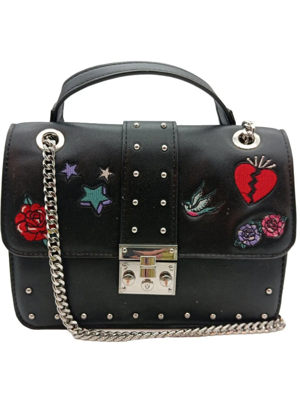 - Details: silberfarbene Hardware, Tragekette, Nietenelemente, Stickereiverzierung, Ösenelemente, Reißverschlussinnenfach, verschließbares Innenfach