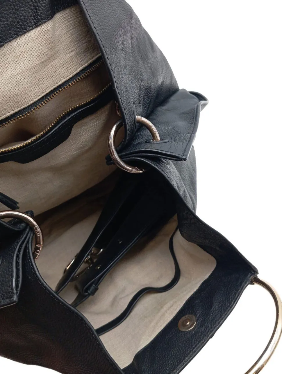 - Details: Standfüßchen, Henkel, Logo-Applikation aus Leder, Metallelemente, Ringelemente, Ösenelemente, Logo-Applikation innen aus Leder, halboffenes Innenfach, Reißverschlussinnenfach